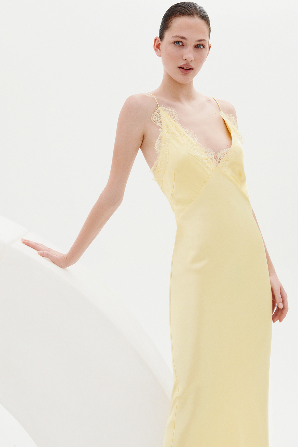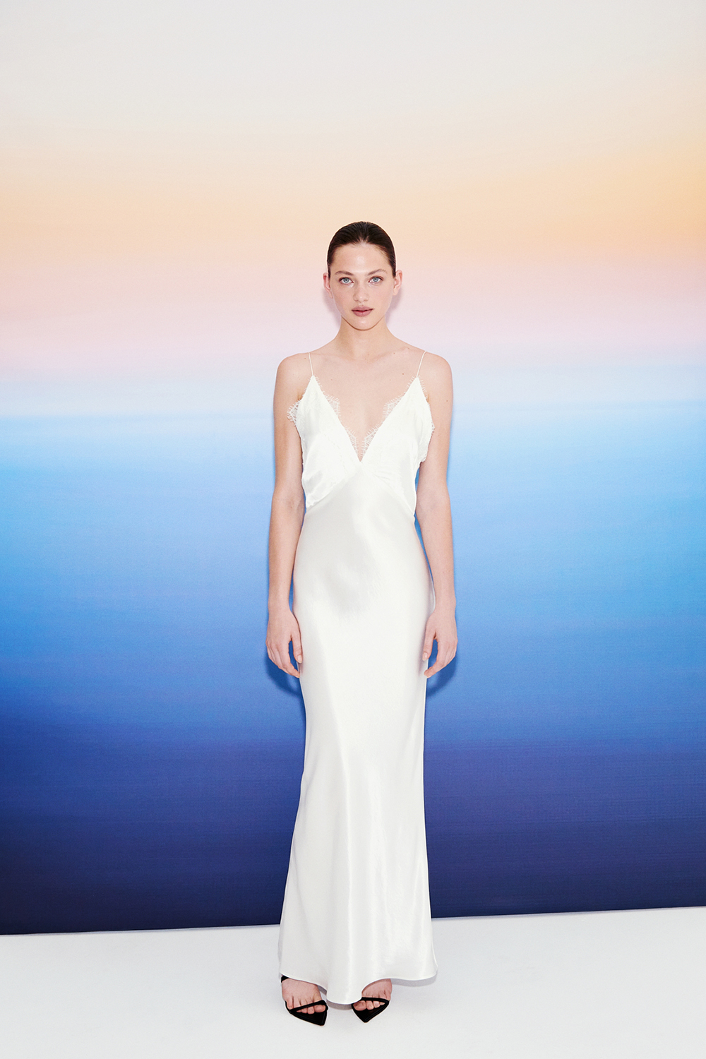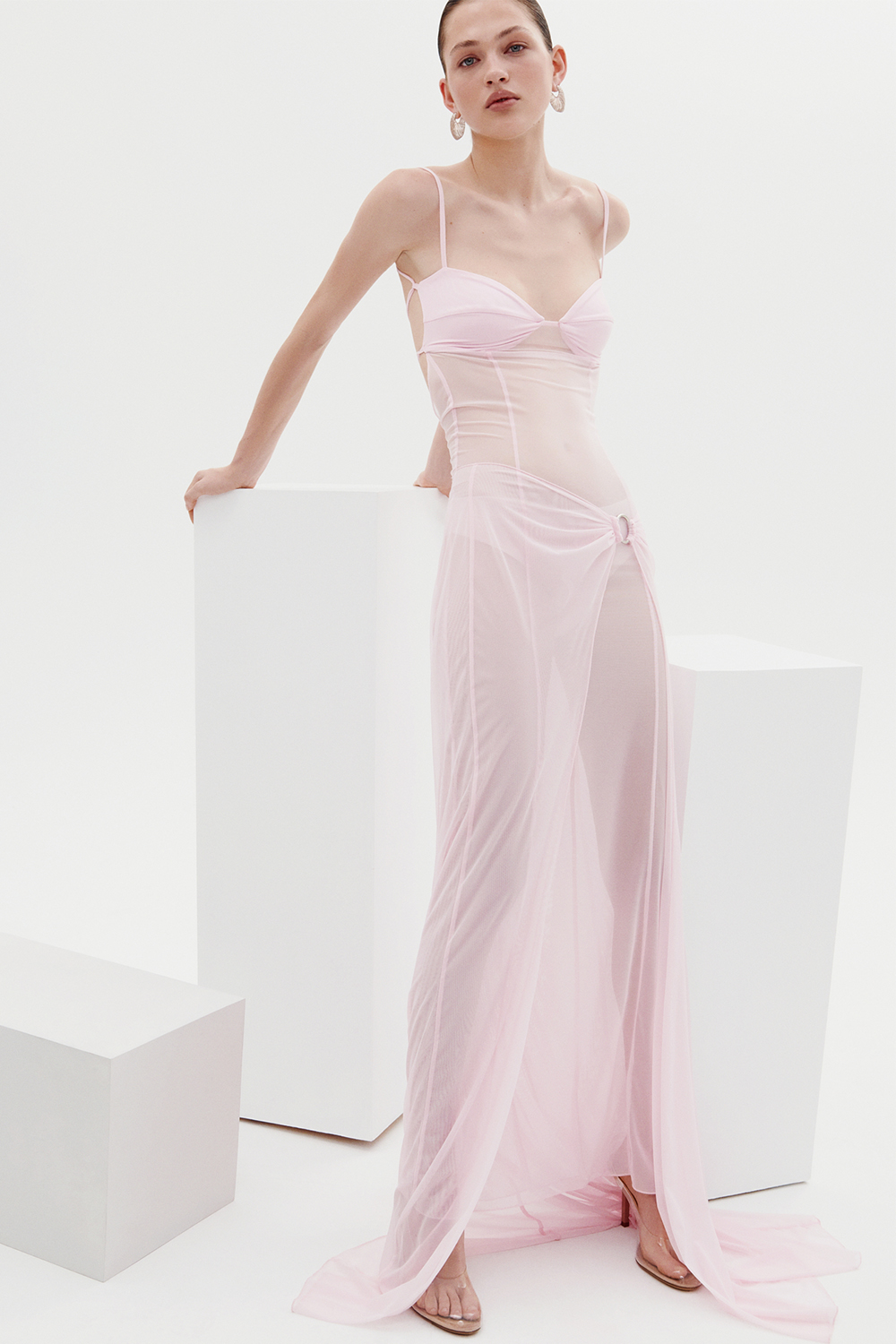 В центрі колекції — максісукні з мереживом, корсетні топи, мініспідниці, напівпрозорі тканини, перламутрові відтінки та пастельна кольорова гама. Особливу увагу привертають силуети з відкритою спиною, драпіруванням і тонкими бретелями, які підкреслюють жіночність і витонченість.